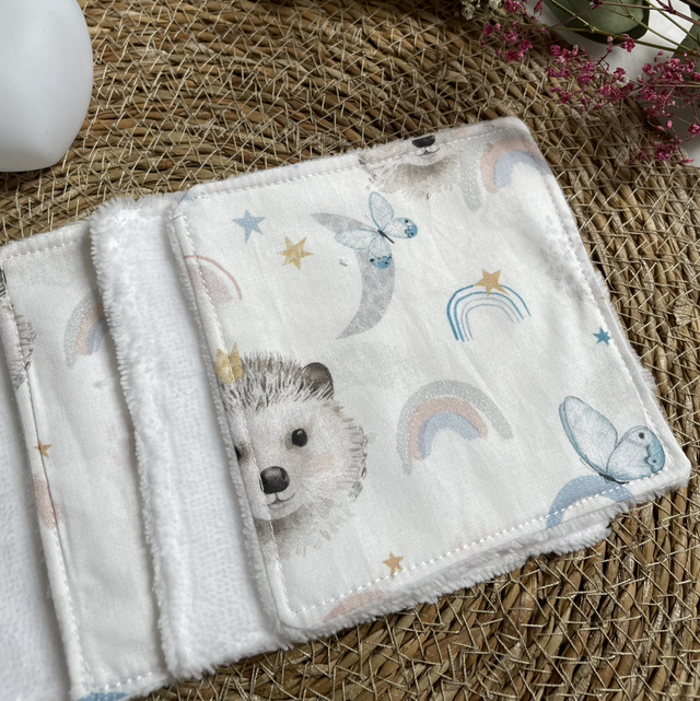 Confectionner en coton imprimé Hérisson oeko tex et en éponge bambou assorti