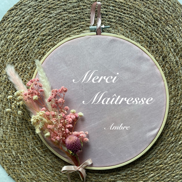Une jolie décoration sur tambour à brodé avec de belles fleurs séchées et l’inscription de votre choix, pour accrocher sur un mur ou une porte